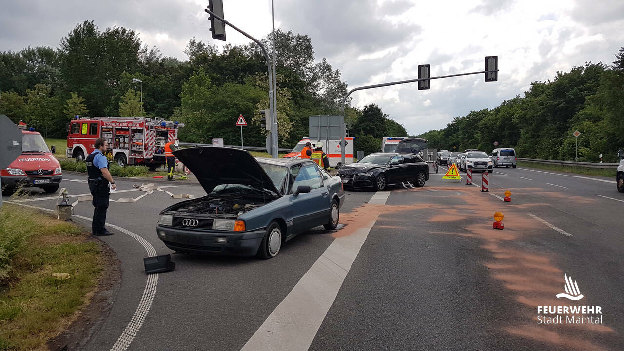 Nach einem Verkehrsunfall mit zwei Fahrzeugen liefen größere Mengen Betriebsmittel aus. Aufgrund der Lage wurde die Stadtteilwehr Hochstadt nachalarmiert. Die Einsatzstelle wurde abgesichert. Die ausgelaufenen Betriebsmittel mit Binder aufgenommen. Aus einem defekten Benzintank wurde der Kraftstoff abgepumpt.