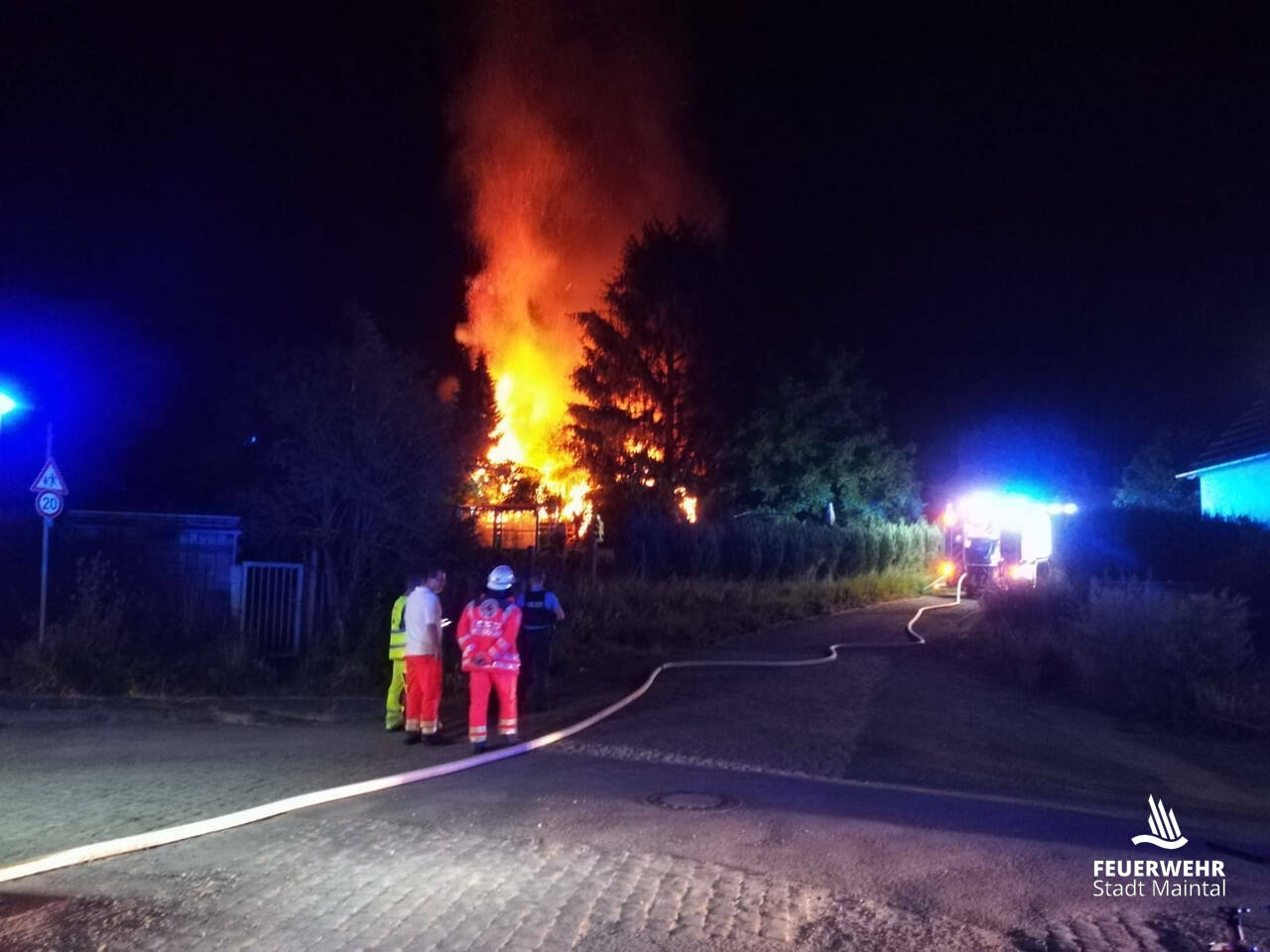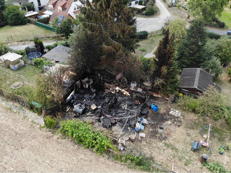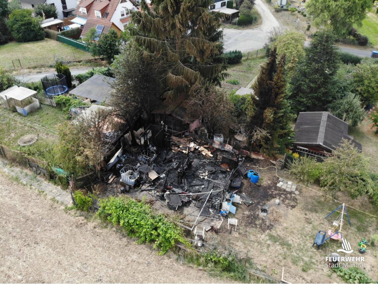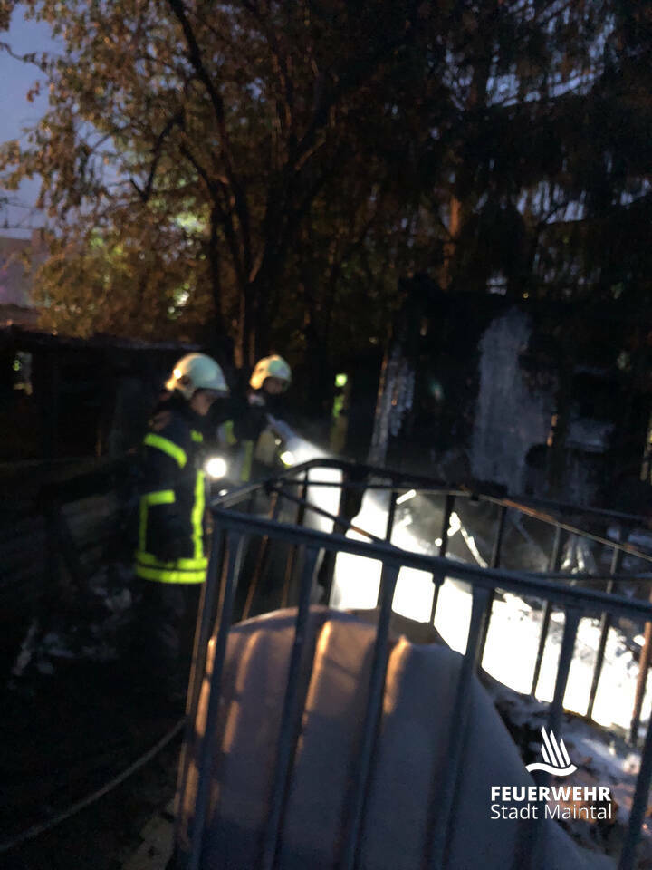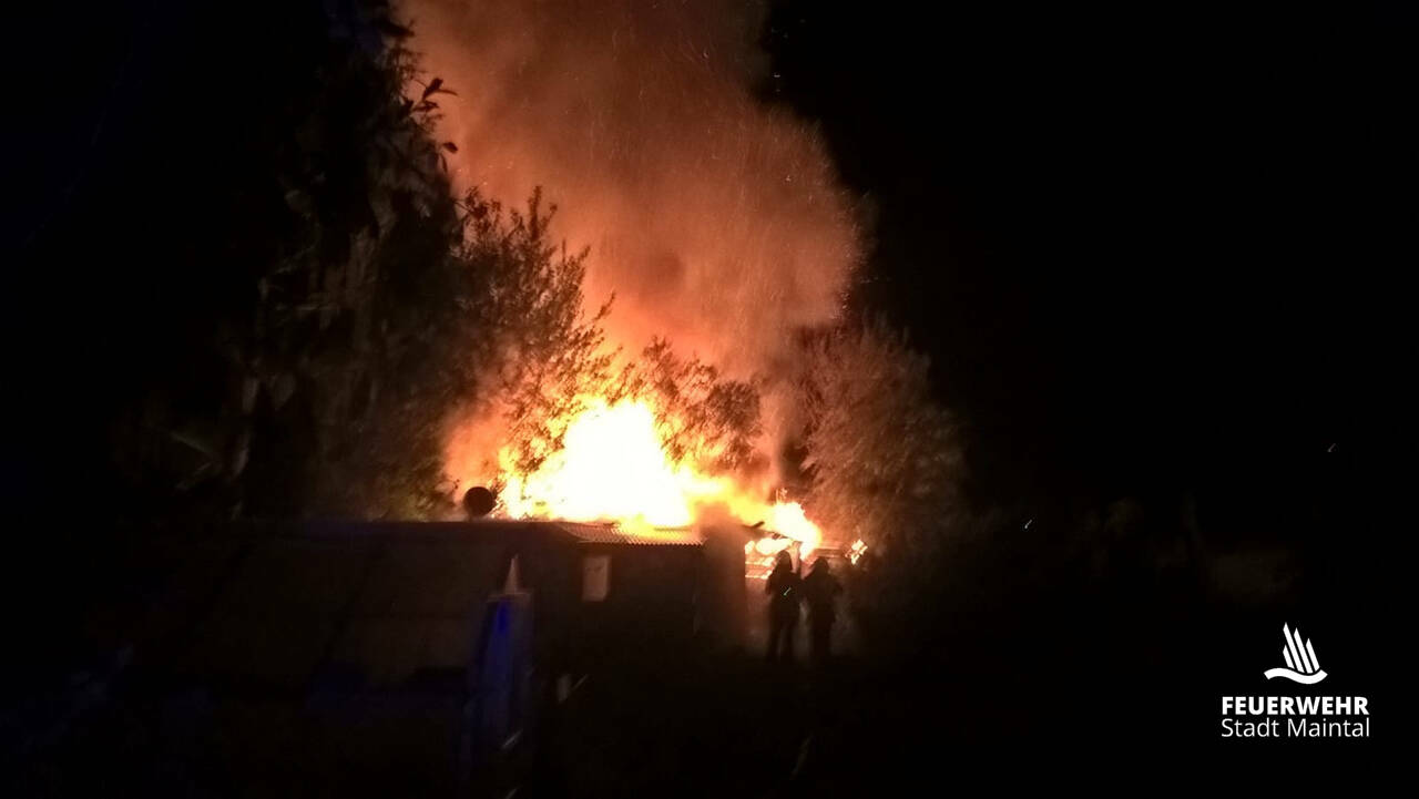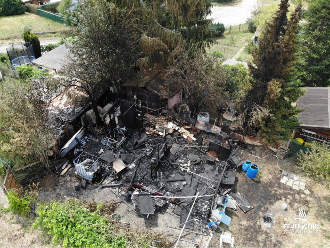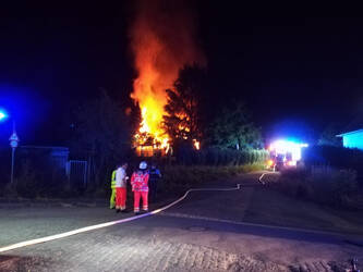 Insgesamt ist eine Gartenhütte inklusive Anbauten komplett Raub der Flammen geworden und 2 weitere Gartenhütten sowie Bäume wurden beschädigt.