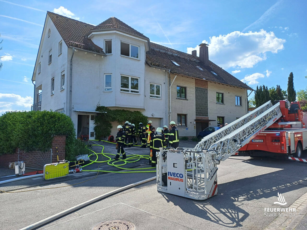 An der Einsatzstelle brannte es im Keller eines Mehrfamilienhauses. Mehreren Personen waren im 2. Obergeschoss eingeschlossen.