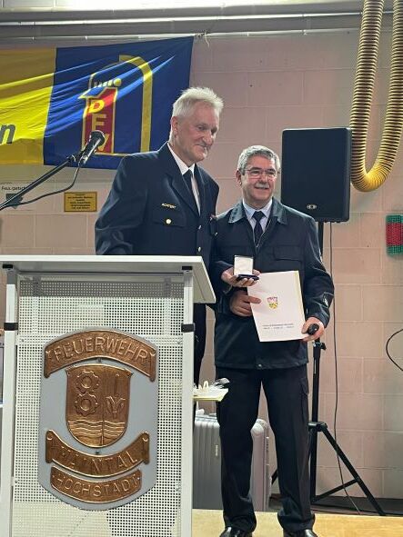 geplanten Anbau des Feuerwehrhauses in Höhe von 76.500,00 €, über den wir uns sehr freuen. Es folgten Danksagungen und Grußworte durch den Landrat des Main-Kinzig-Kreises Thorsten Stolz, der Bürgermeisterin der Stadt Maintal Monika Böttcher, dem Kreisbrandmeister Volker Achtert, dem Stadtbrandinspektor Holger Martiker, sowie dem Hochstädter Wehrführer Lukas Nöthlich. Der 2. Vorsitzende des Fördervereins, Manuel Fischer, trug eine Chronik mit den Highlights der letzten 100 Jahre vor, bevor dann langjährige Vereinsmitglieder für ihre Zugehörigkeit und ihr Engagement feierlich geehrt wurden. Stellvertretend für die Hochstädter Wehr verlieh daher Kreisbrandmeister Volker Achtert Michael Harnisch die Feuerwehrmedaille des Kreisfeuerwehrverbands in Silber für besondere Verdienste. Musikalisch wurde der Abend durch Reiner Vogel begleitet. Für die Gaumenfreude zauberte uns das Team um Hartwig's Partyservice aus Wachenbuchen ein leckeres Buffet, abgerundet wurde dies durch einen Crêpes Stand und einem Eiswagen, der eigens aus Bischofsheim angeradelt kam.